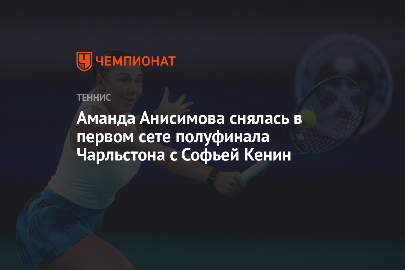 Американская теннисистка Аманда Анисимова, занимающая 16-ю строчку мирового рейтинга, прекратила борьбу в полуфинале турнира WTA 500 в Чарльстоне (США). Она снялась с матча против своей соотечественницы Софии Кенин, 44-й ракетки мира, в первом сете при счете 5/2 в пользу Кенин. Матч продолжался 29 минут.